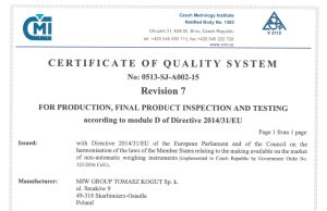 W/w. certyfikaty upoważniają nas do udostępniania na rynku wag nieautomatycznych opatrzonych wystawioną przez nas, jako producenta, deklaracją zgodności z typem w oparciu o zapewnienie jakości procesu produkcyjnego zgodnie z modułem D Dyrektywy Parlamentu Europejskiego i Rady 2014/31/UE.
