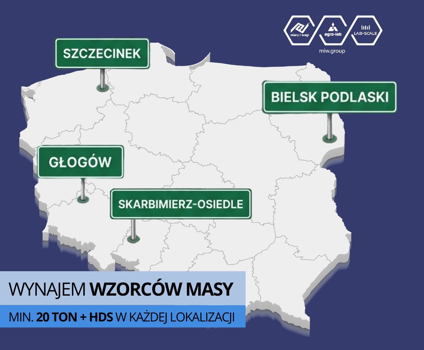 Wszystkie wzorce posiadają ważne świadectwa wzorcowań wydane przez akredytowane laboratorium (wzorcowane są co 13 miesięcy). Znajdujemy się na liście dostawców dużych wzorców masy prowadzonej przez Główny Urząd Miar. Trzy lokalizacje składowania wzorców pozwalają na szybki i łatwy dojazd do klienta w każdym regionie. Oferujemy dowóz wzorców naszym własnym transportem – samochód ciężarowy wyposażony w HDS.